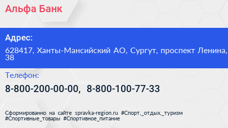 Альфа-Банк по адресу 628417, Ханты-Мансийский АО, Сургут, проспект Ленина, 38 в дальнейшем Организация, размещена в следующих категориях:
