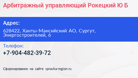 Арбитражный управляющий Рокецкий Ю.Б. по адресу 628422, Ханты-Мансийский АО, Сургут, Энергостроителей, 6 в дальнейшем Организация, размещена в следующих категориях: