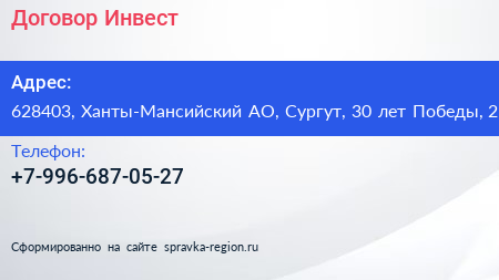 Договор-Инвест по адресу 628403, Ханты-Мансийский АО, Сургут, 30 лет Победы, 21 в дальнейшем Организация, размещена в следующих категориях: