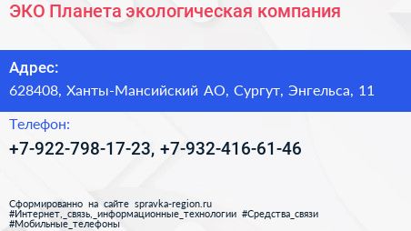 ЭКО Планета, экологическая компания по адресу 628408, Ханты-Мансийский АО, Сургут, Энгельса, 11 в дальнейшем Организация, размещена в следующих категориях: