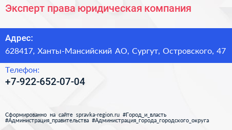 Эксперт права, юридическая компания по адресу 628417, Ханты-Мансийский АО, Сургут, Островского, 47 в дальнейшем Организация, размещена в следующих категориях: