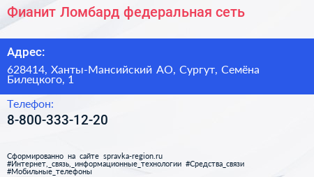 Фианит-Ломбард, федеральная сеть по адресу 628414, Ханты-Мансийский АО, Сургут, Семёна Билецкого, 1 в дальнейшем Организация, размещена в следующих категориях: