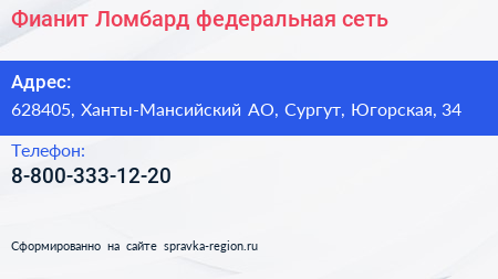 Фианит-Ломбард, федеральная сеть по адресу 628405, Ханты-Мансийский АО, Сургут, Югорская, 34 в дальнейшем Организация, размещена в следующих категориях: