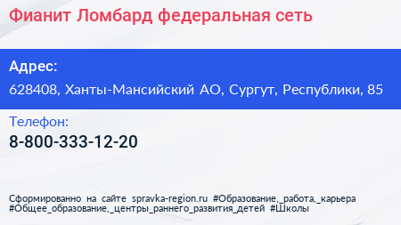 Фианит-Ломбард, федеральная сеть по адресу 628408, Ханты-Мансийский АО, Сургут, Республики, 85 в дальнейшем Организация, размещена в следующих категориях: