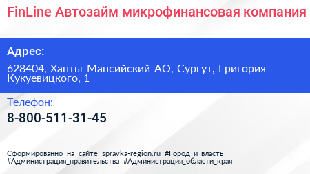 FinLine-Автозайм, микрофинансовая компания по адресу 628404, Ханты-Мансийский АО, Сургут, Григория Кукуевицкого, 1 в дальнейшем Организация, размещена в следующих категориях: