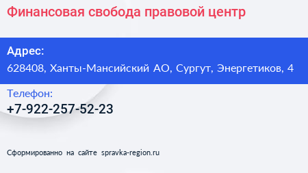 Финансовая свобода, правовой центр по адресу 628408, Ханты-Мансийский АО, Сургут, Энергетиков, 4 в дальнейшем Организация, размещена в следующих категориях: