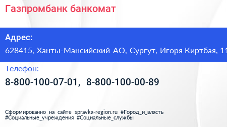 Газпромбанк, банкомат по адресу 628415, Ханты-Мансийский АО, Сургут, Игоря Киртбая, 11 в дальнейшем Организация, размещена в следующих категориях: