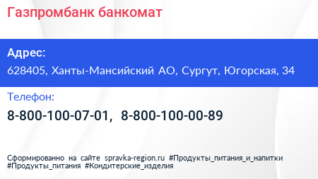 Газпромбанк, банкомат по адресу 628405, Ханты-Мансийский АО, Сургут, Югорская, 34 в дальнейшем Организация, размещена в следующих категориях: