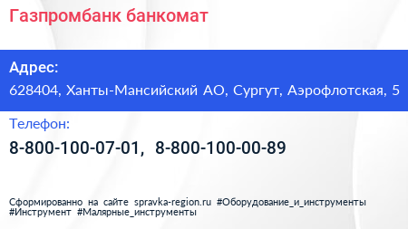 Газпромбанк, банкомат по адресу 628404, Ханты-Мансийский АО, Сургут, Аэрофлотская, 5 в дальнейшем Организация, размещена в следующих категориях: