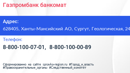 Газпромбанк, банкомат по адресу 628405, Ханты-Мансийский АО, Сургут, Геологическая, 24 в дальнейшем Организация, размещена в следующих категориях: