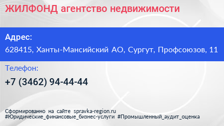 ЖИЛФОНД, агентство недвижимости по адресу 628415, Ханты-Мансийский АО, Сургут, Профсоюзов, 11 в дальнейшем Организация, размещена в следующих категориях: