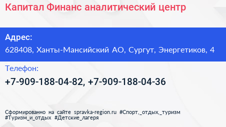 Капитал Финанс, аналитический центр по адресу 628408, Ханты-Мансийский АО, Сургут, Энергетиков, 4 в дальнейшем Организация, размещена в следующих категориях: