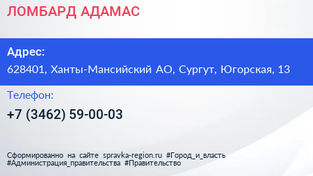 ЛОМБАРД АДАМАС по адресу 628401, Ханты-Мансийский АО, Сургут, Югорская, 13 в дальнейшем Организация, размещена в следующих категориях: