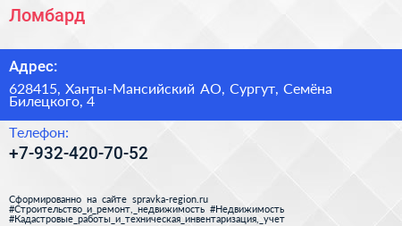 Ломбард по адресу 628415, Ханты-Мансийский АО, Сургут, Семёна Билецкого, 4 в дальнейшем Организация, размещена в следующих категориях:
