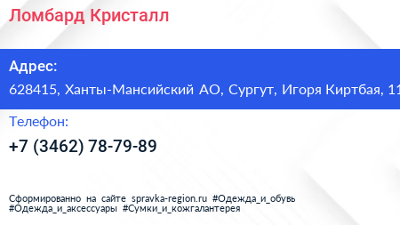Ломбард Кристалл по адресу 628415, Ханты-Мансийский АО, Сургут, Игоря Киртбая, 11 в дальнейшем Организация, размещена в следующих категориях: