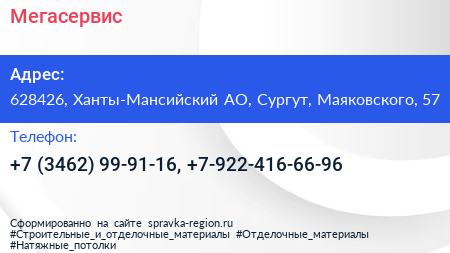 Мегасервис по адресу 628426, Ханты-Мансийский АО, Сургут, Маяковского, 57 в дальнейшем Организация, размещена в следующих категориях:
