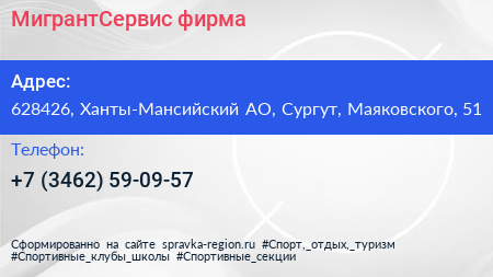 МигрантСервис, фирма по адресу 628426, Ханты-Мансийский АО, Сургут, Маяковского, 51 в дальнейшем Организация, размещена в следующих категориях: