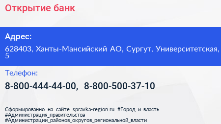 Открытие, банк по адресу 628403, Ханты-Мансийский АО, Сургут, Университетская, 5 в дальнейшем Организация, размещена в следующих категориях:
