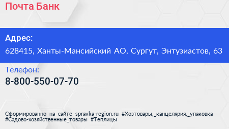Почта Банк по адресу 628415, Ханты-Мансийский АО, Сургут, Энтузиастов, 63 в дальнейшем Организация, размещена в следующих категориях: