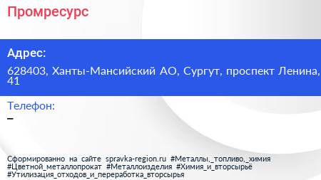 Промресурс по адресу 628403, Ханты-Мансийский АО, Сургут, проспект Ленина, 41 в дальнейшем Организация, размещена в следующих категориях:
