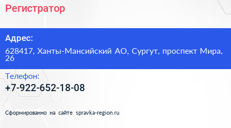 Регистратор по адресу 628417, Ханты-Мансийский АО, Сургут, проспект Мира, 26 в дальнейшем Организация, размещена в следующих категориях: