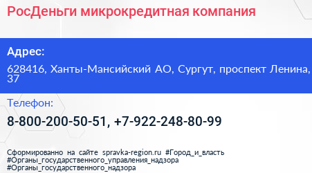 РосДеньги, микрокредитная компания по адресу 628416, Ханты-Мансийский АО, Сургут, проспект Ленина, 37 в дальнейшем Организация, размещена в следующих категориях:
