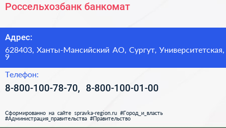 Россельхозбанк, банкомат по адресу 628403, Ханты-Мансийский АО, Сургут, Университетская, 9 в дальнейшем Организация, размещена в следующих категориях: