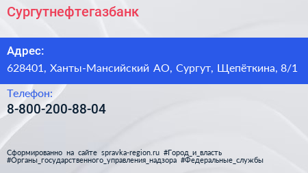 Сургутнефтегазбанк по адресу 628401, Ханты-Мансийский АО, Сургут, Щепёткина, 8/1 в дальнейшем Организация, размещена в следующих категориях: