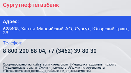 Сургутнефтегазбанк по адресу 628408, Ханты-Мансийский АО, Сургут, Югорский тракт, 38 в дальнейшем Организация, размещена в следующих категориях: