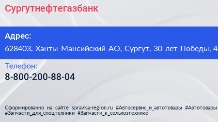 Сургутнефтегазбанк по адресу 628403, Ханты-Мансийский АО, Сургут, 30 лет Победы, 46 в дальнейшем Организация, размещена в следующих категориях: