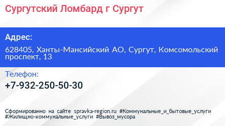 Сургутский Ломбард, г. Сургут по адресу 628405, Ханты-Мансийский АО, Сургут, Комсомольский проспект, 13 в дальнейшем Организация, размещена в следующих категориях: