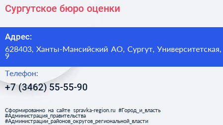 Сургутское бюро оценки по адресу 628403, Ханты-Мансийский АО, Сургут, Университетская, 9 в дальнейшем Организация, размещена в следующих категориях:
