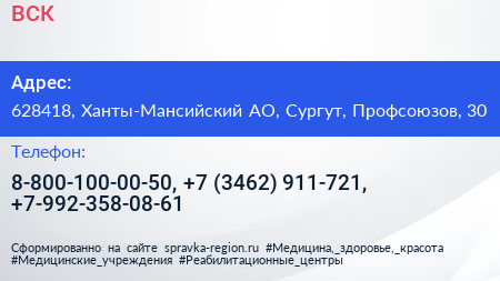 ВСК по адресу 628418, Ханты-Мансийский АО, Сургут, Профсоюзов, 30 в дальнейшем Организация, размещена в следующих категориях: