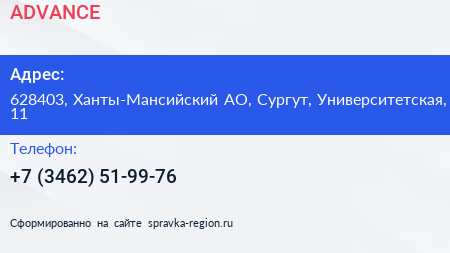 ADVANCE по адресу 628403, Ханты-Мансийский АО, Сургут, Университетская, 11 в дальнейшем Организация, размещена в следующих категориях: