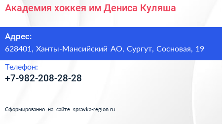 Академия хоккея им. Дениса Куляша по адресу 628401, Ханты-Мансийский АО, Сургут, Сосновая, 19 в дальнейшем Организация, размещена в следующих категориях:
