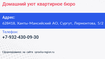 Домашний уют, квартирное бюро по адресу 628418, Ханты-Мансийский АО, Сургут, Лермонтова, 5/2 в дальнейшем Организация, размещена в следующих категориях: