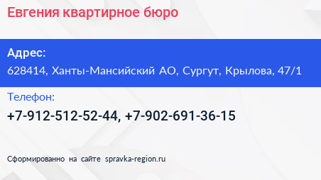 Евгения, квартирное бюро по адресу 628414, Ханты-Мансийский АО, Сургут, Крылова, 47/1 в дальнейшем Организация, размещена в следующих категориях: