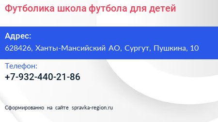 Футболика, школа футбола для детей по адресу 628426, Ханты-Мансийский АО, Сургут, Пушкина, 10 в дальнейшем Организация, размещена в следующих категориях:
