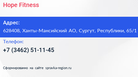 Hope Fitness по адресу 628408, Ханты-Мансийский АО, Сургут, Республики, 65/1 в дальнейшем Организация, размещена в следующих категориях: