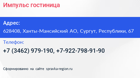 Импульс, гостиница по адресу 628408, Ханты-Мансийский АО, Сургут, Республики, 67 в дальнейшем Организация, размещена в следующих категориях: