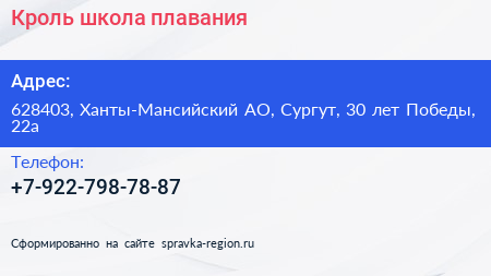 Кроль, школа плавания по адресу 628403, Ханты-Мансийский АО, Сургут, 30 лет Победы, 22а в дальнейшем Организация, размещена в следующих категориях: