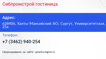 Сибпромстрой, гостиница по адресу 628406, Ханты-Мансийский АО, Сургут, Университетская, 25а в дальнейшем Организация, размещена в следующих категориях: