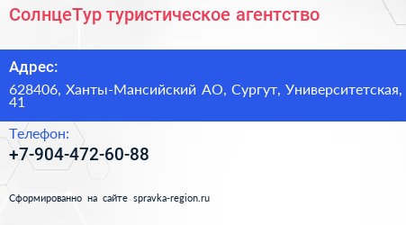 СолнцеТур, туристическое агентство по адресу 628406, Ханты-Мансийский АО, Сургут, Университетская, 41 в дальнейшем Организация, размещена в следующих категориях: