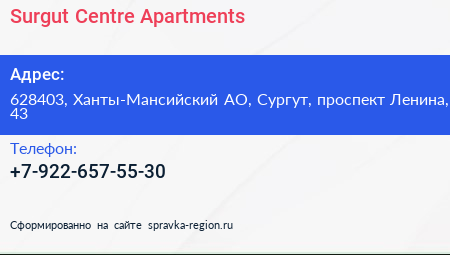 Surgut Centre Apartments по адресу 628403, Ханты-Мансийский АО, Сургут, проспект Ленина, 43 в дальнейшем Организация, размещена в следующих категориях: