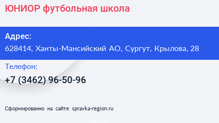 ЮНИОР, футбольная школа по адресу 628414, Ханты-Мансийский АО, Сургут, Крылова, 28 в дальнейшем Организация, размещена в следующих категориях: