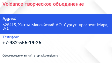 Voldance, творческое объединение по адресу 628415, Ханты-Мансийский АО, Сургут, проспект Мира, 3/1 в дальнейшем Организация, размещена в следующих категориях: