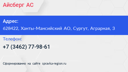Айсберг АС по адресу 628422, Ханты-Мансийский АО, Сургут, Аграрная, 3 в дальнейшем Организация, размещена в следующих категориях: