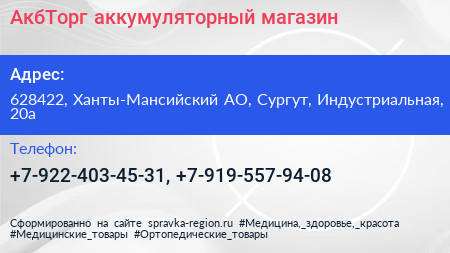 АкбТорг, аккумуляторный магазин по адресу 628422, Ханты-Мансийский АО, Сургут, Индустриальная, 20а в дальнейшем Организация, размещена в следующих категориях: