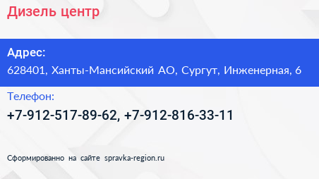 Дизель-центр по адресу 628401, Ханты-Мансийский АО, Сургут, Инженерная, 6 в дальнейшем Организация, размещена в следующих категориях: