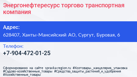 Энергонефтересурс, торгово-транспортная компания по адресу 628407, Ханты-Мансийский АО, Сургут, Буровая, 6 в дальнейшем Организация, размещена в следующих категориях: